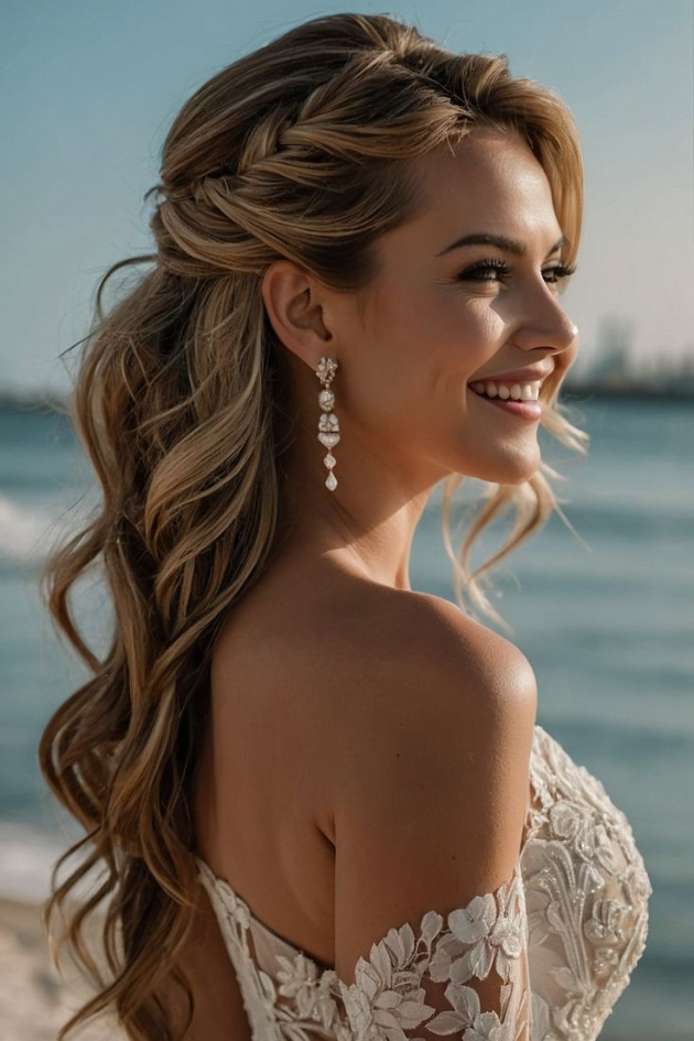 Create a soft, elegant bridal look by styling your hair into loose waves with a braided half-up twist. This hairstyle beautifully frames your face and works perfectly for beach or outdoor weddings.
