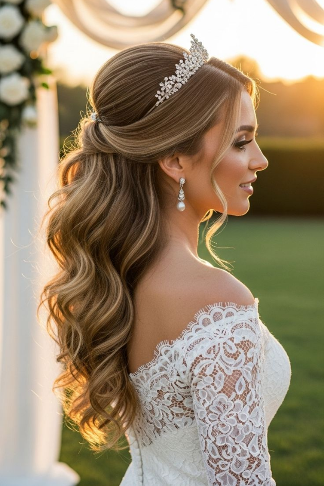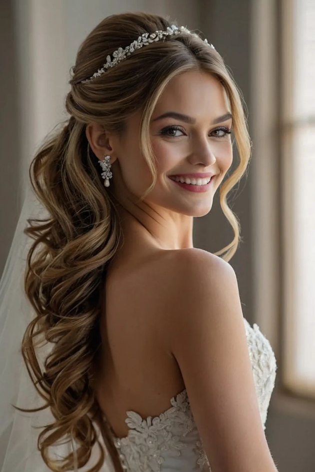 2. Elegant Half-Up Curled Bridal Hairstyle with Tiara