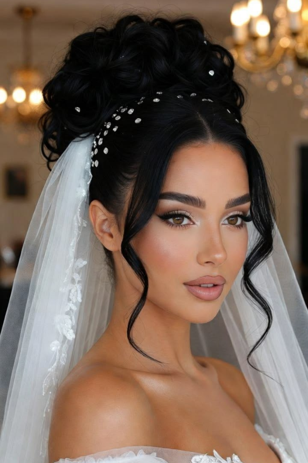 Choose a voluminous high bun with soft curled tendrils to frame your face beautifully. Add delicate crystal accents and a veil to create a sophisticated bridal hairstyle perfect for classic and elegant weddings.