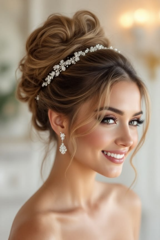 Elevate your wedding look with a soft voluminous updo and delicate face-framing strands. Add a crystal headband and matching earrings to create a timeless, graceful hairstyle that photographs beautifully from every angle.