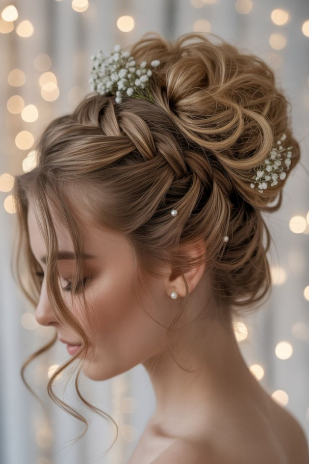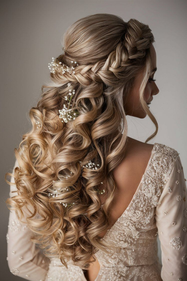 Create a soft bridal look by styling your hair into voluminous curls with a braided half-up crown. Add baby’s breath accents throughout to give your wedding hairstyle a romantic, graceful finish.