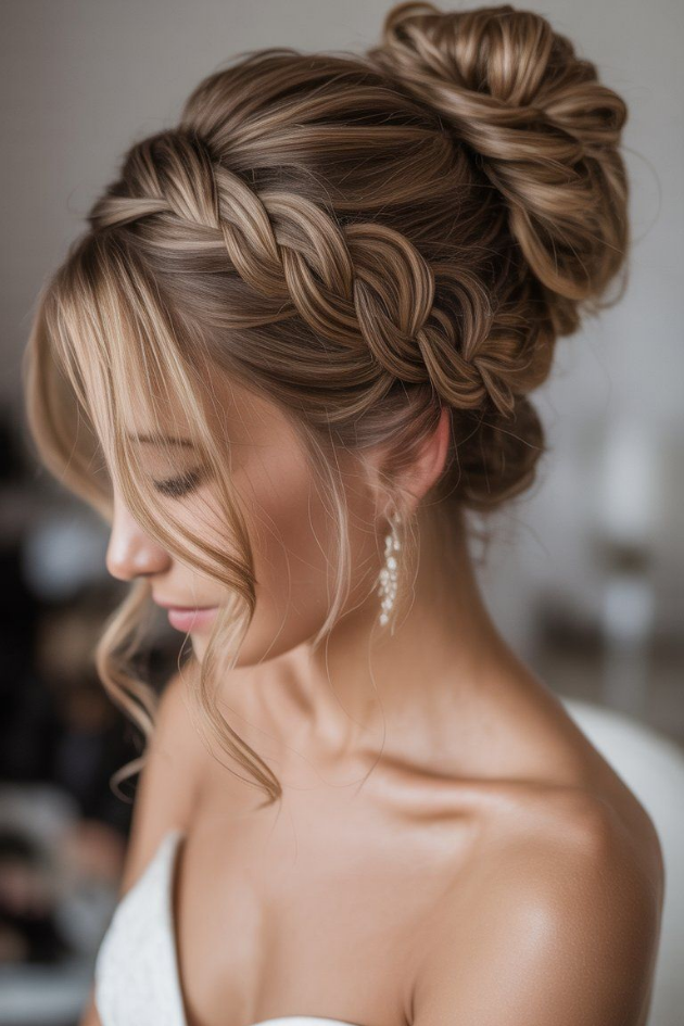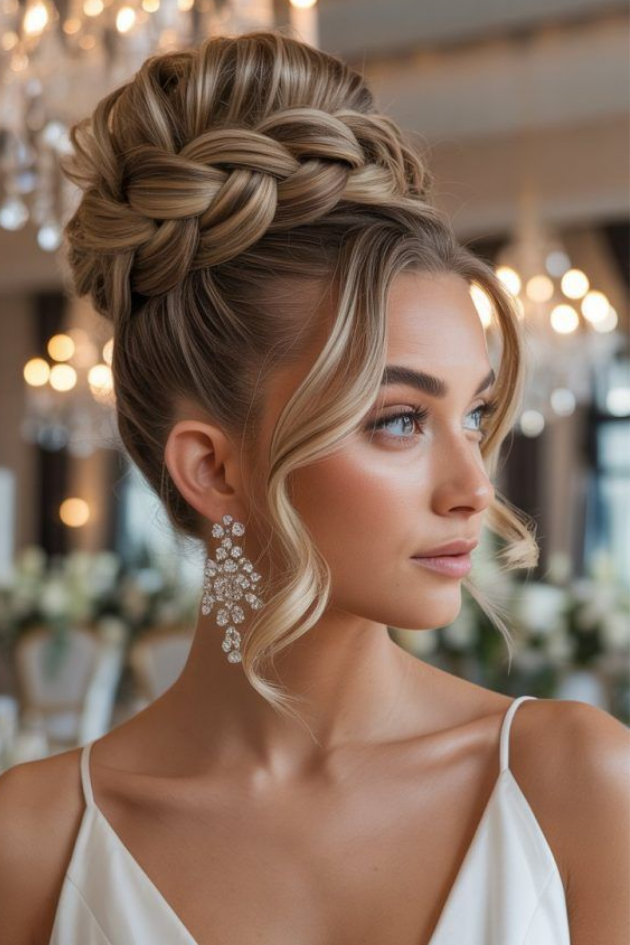 Style your wedding hair into a chic high updo with a crown braid for volume and elegance. Leave soft front curls loose to frame your face and enhance your bridal glow beautifully.