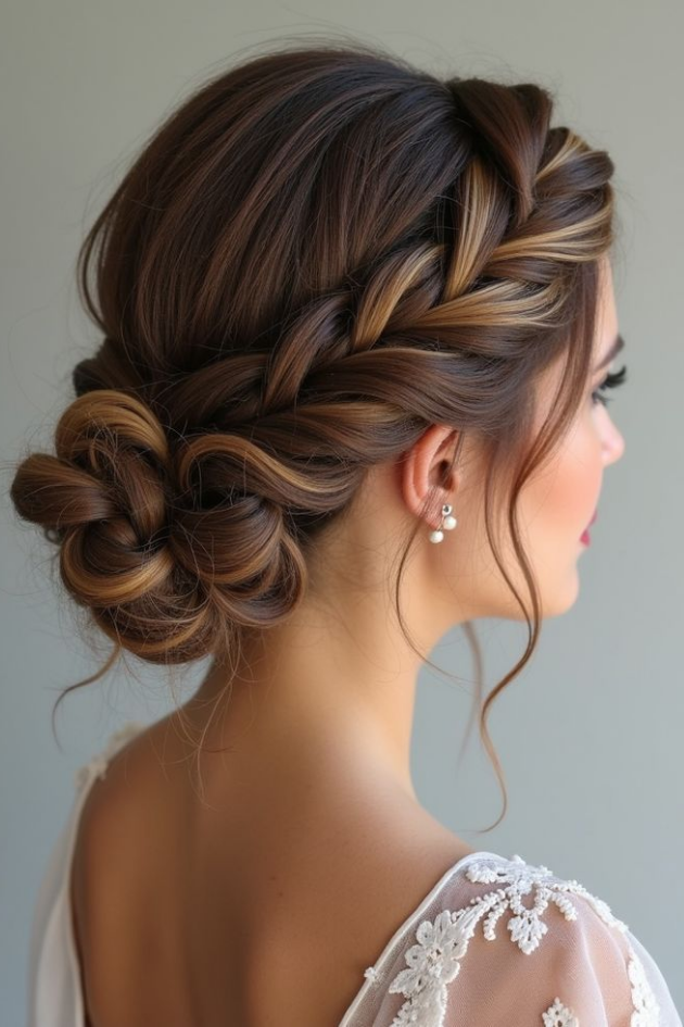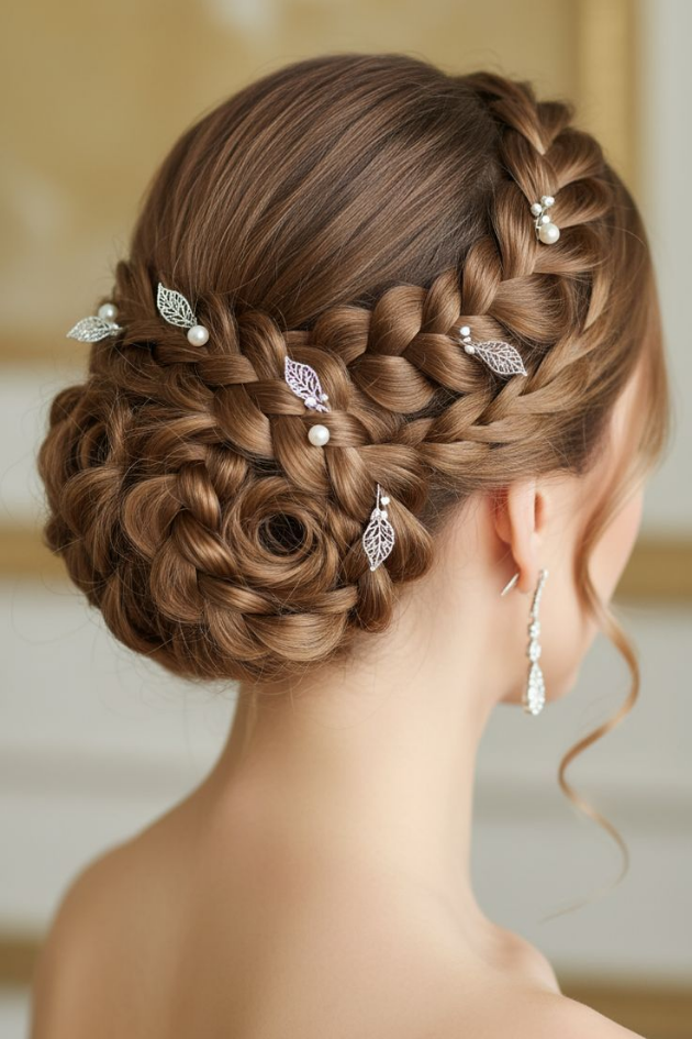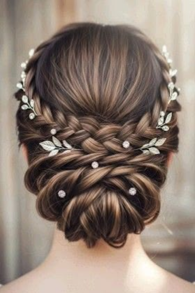 A timeless wedding hairstyle featuring softly woven braids wrapped into a sleek low chignon. Delicate pearl and leaf accents add a graceful finish, making this elegant bridal updo perfect for ceremonies, receptions, and formal celebrations.