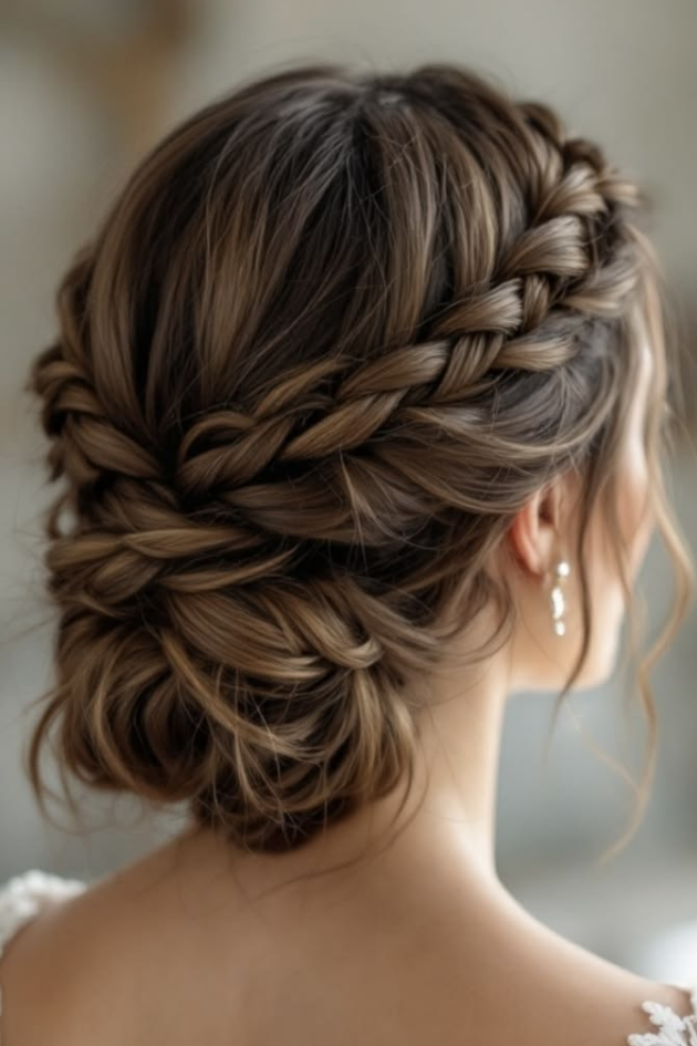 Create an elegant wedding hairstyle by weaving soft double braids into a textured low updo. This look gives you volume, romance, and a secure style that stays beautiful throughout your special day.