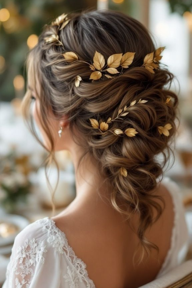 Create a dreamy boho wedding look by styling your hair into a soft textured updo and adding golden leaf accessories. This hairstyle gives you romantic volume and a graceful, nature-inspired bridal finish.