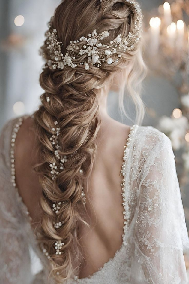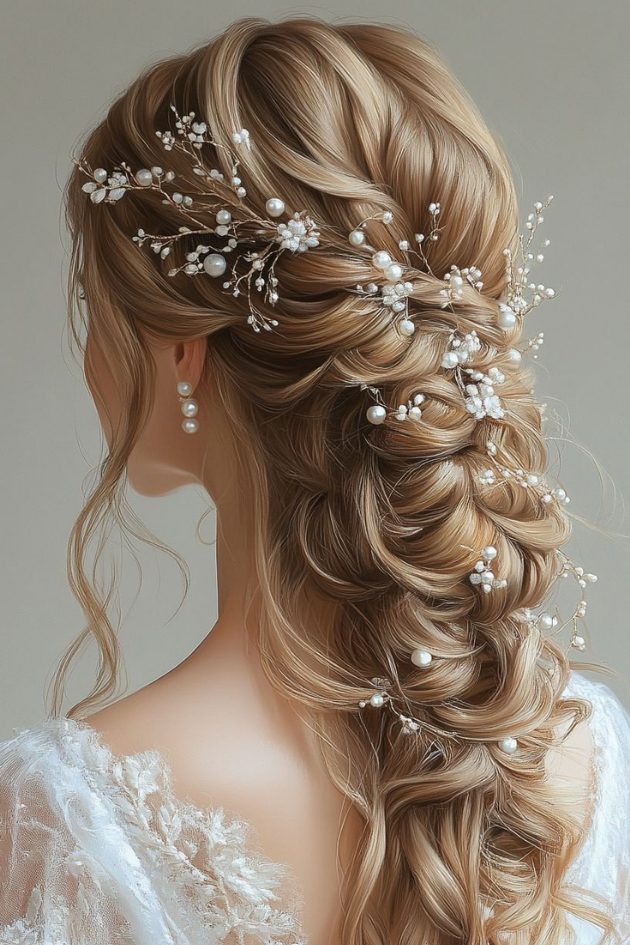 Create a stunning wedding look by styling your hair into a voluminous side braid with soft cascading waves. Add pearl and floral hair accessories to give your bridal hairstyle an elegant, fairytale-inspired finish.