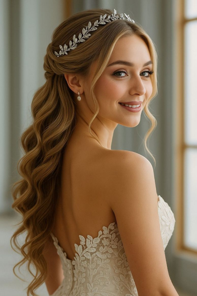 12. Elegant Half-Up Bridal Waves with Leaf Tiara