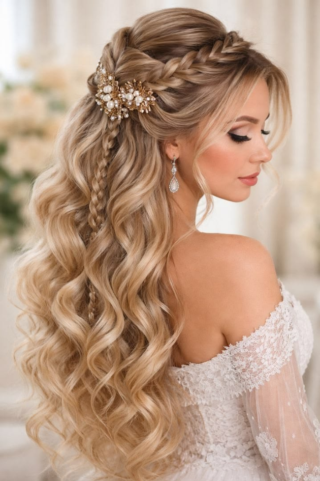 Style your wedding hair into soft, voluminous waves with a half-up braid for graceful texture. Add a pearl floral clip and delicate mini braids to create a luxurious, princess-inspired bridal hairstyle.