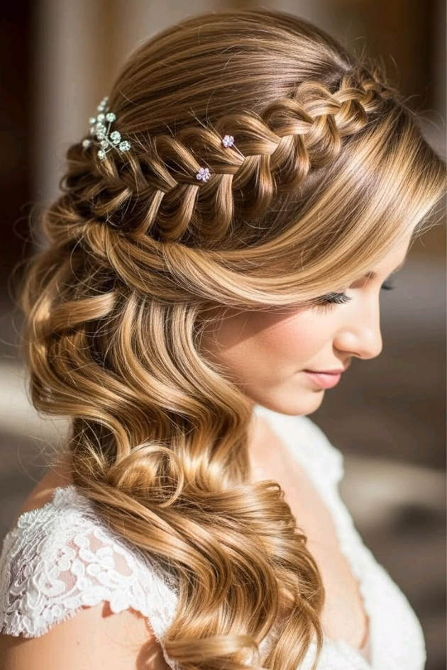 Create a soft, romantic wedding look by styling your hair into loose cascading waves with a side braid crown. Add tiny floral pins for a delicate finish that beautifully enhances your bridal elegance.
