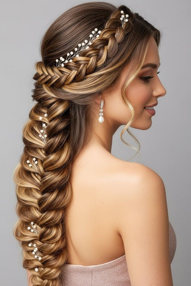 16. Elegant Fishtail Bridal Braid with Pearl Hair Pins
