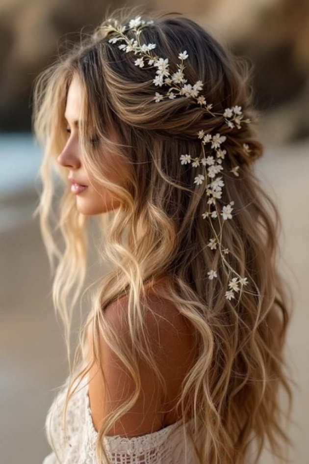 Create a dreamy beach wedding look with soft tousled waves and a delicate floral hair vine. Let loose face-framing strands fall naturally to give your bridal hairstyle a romantic boho finish.