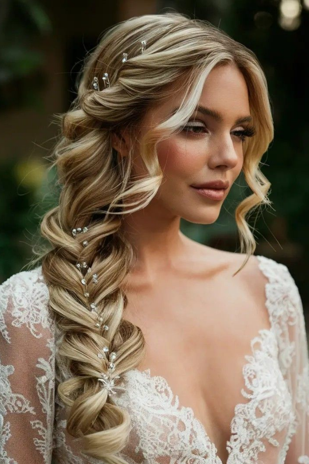 Create an elegant wedding look by styling your hair into a loose side braid with soft volume. Add crystal pins and face-framing curls to give your bridal hairstyle a graceful, dreamy finish.