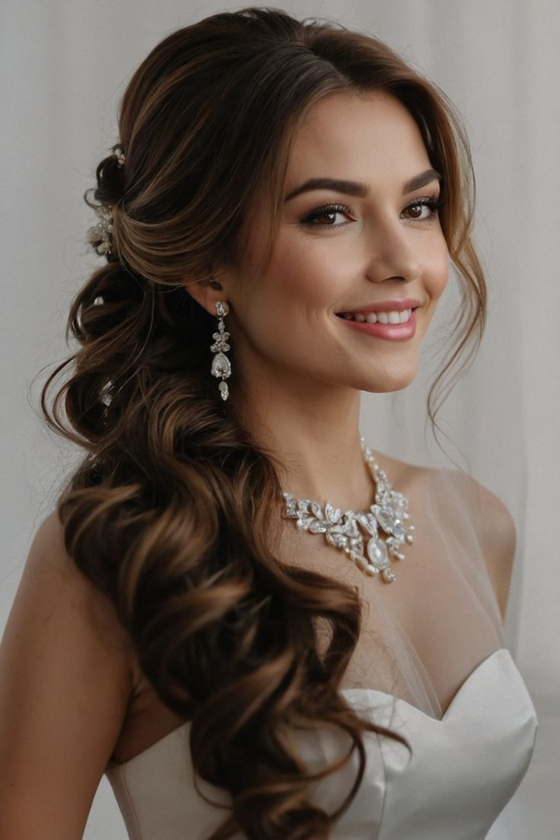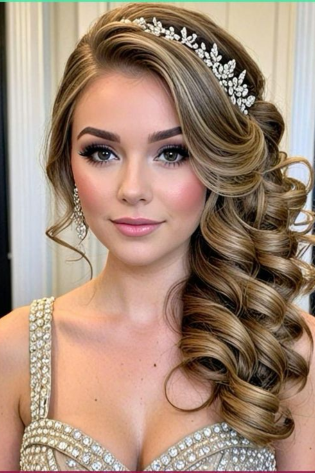 Create a glamorous wedding look by sweeping voluminous curls to one side. Add a crystal headband and soft front volume to give your bridal hairstyle a luxurious, red-carpet-inspired finish that photographs beautifully.