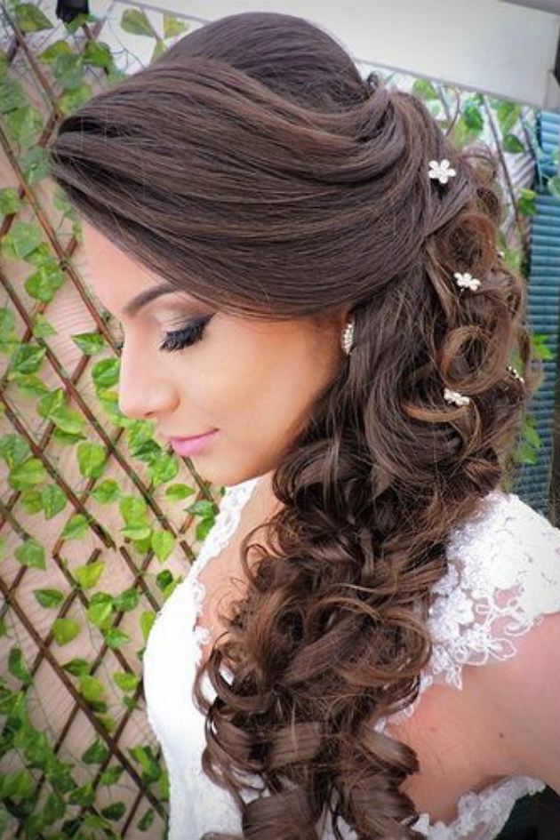 Create a timeless wedding look by sweeping your hair to one side with soft, defined curls. Add gentle crown volume and delicate accessories to give your bridal hairstyle a polished, romantic finish.