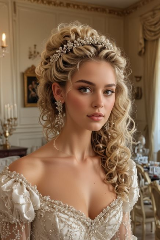 24. Royal Curly Bridal Hairstyle with Pearl Crown