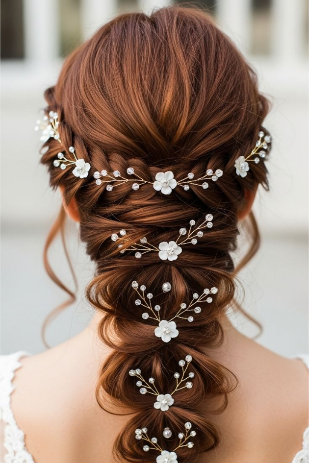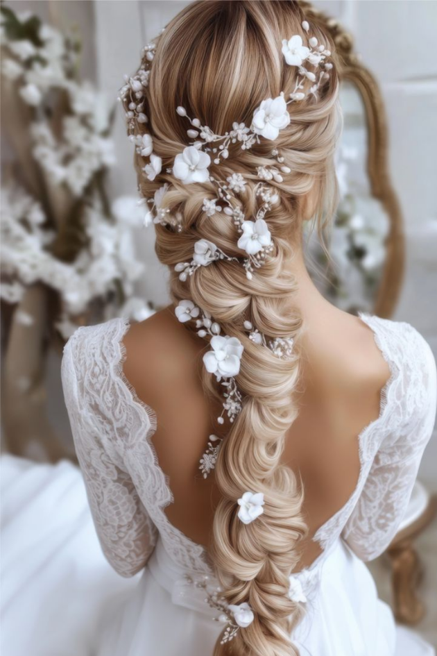 Create a dreamy wedding look by styling your hair into a soft, voluminous braid. Add white floral pins and pearl accents throughout to give your bridal hairstyle a romantic, fairytale-inspired finish.