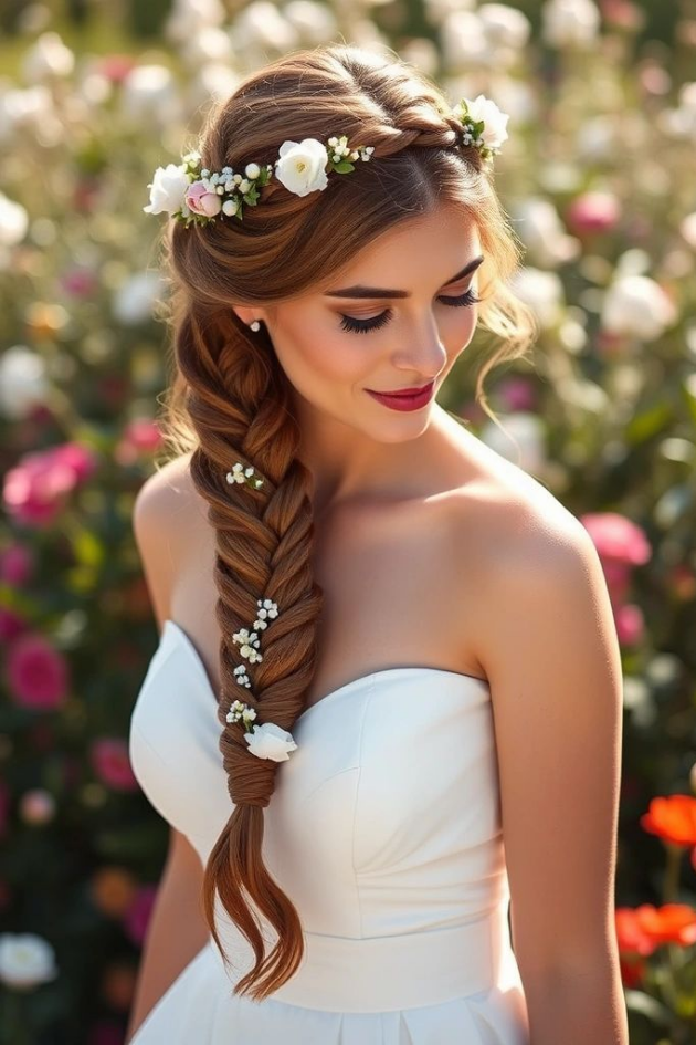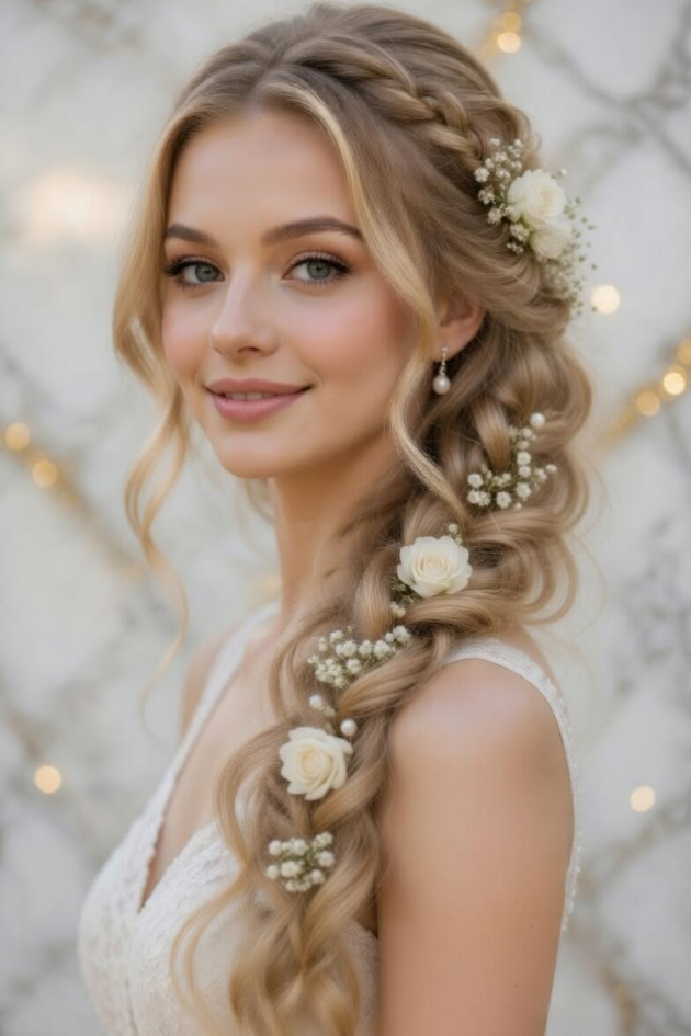 Create a dreamy wedding look by styling your hair into a loose side braid with soft waves. Add white roses and baby’s breath to give your bridal hairstyle a fresh, romantic finish.