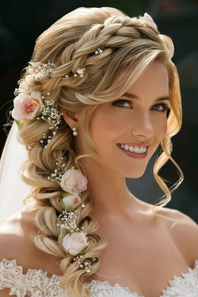 Create a soft, romantic wedding look by styling your hair into a side braid with crown twists. Add blush roses and baby’s breath for a delicate bridal hairstyle that feels timeless and elegant.