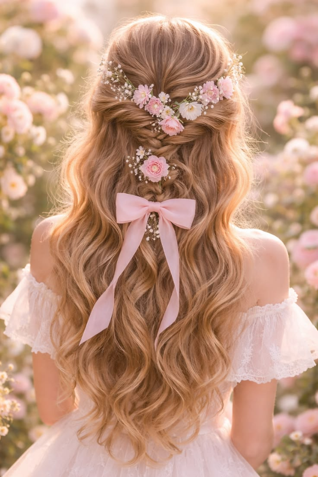 Create a dreamy wedding look by styling your hair into soft half-up waves with a delicate center braid. Add pink flowers and a satin ribbon bow for a sweet, romantic bridal finish.