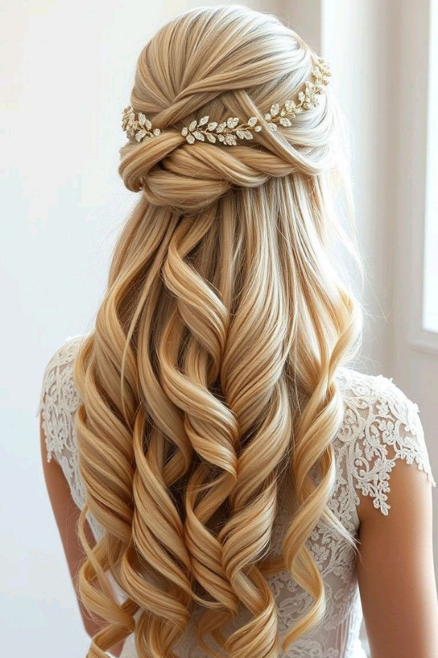 31. Elegant Half-Up Bridal Curls with Gold Leaf Headband