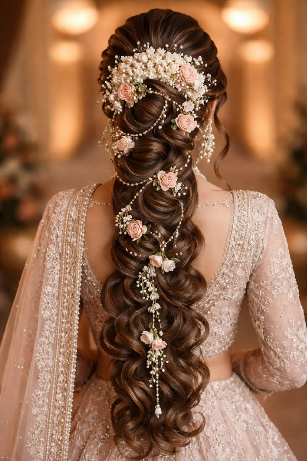 Create a stunning bridal look by styling your hair into a long bubble braid with soft curls. Add blush roses, baby’s breath, and pearl strands for a luxurious, fairytale-inspired wedding hairstyle.