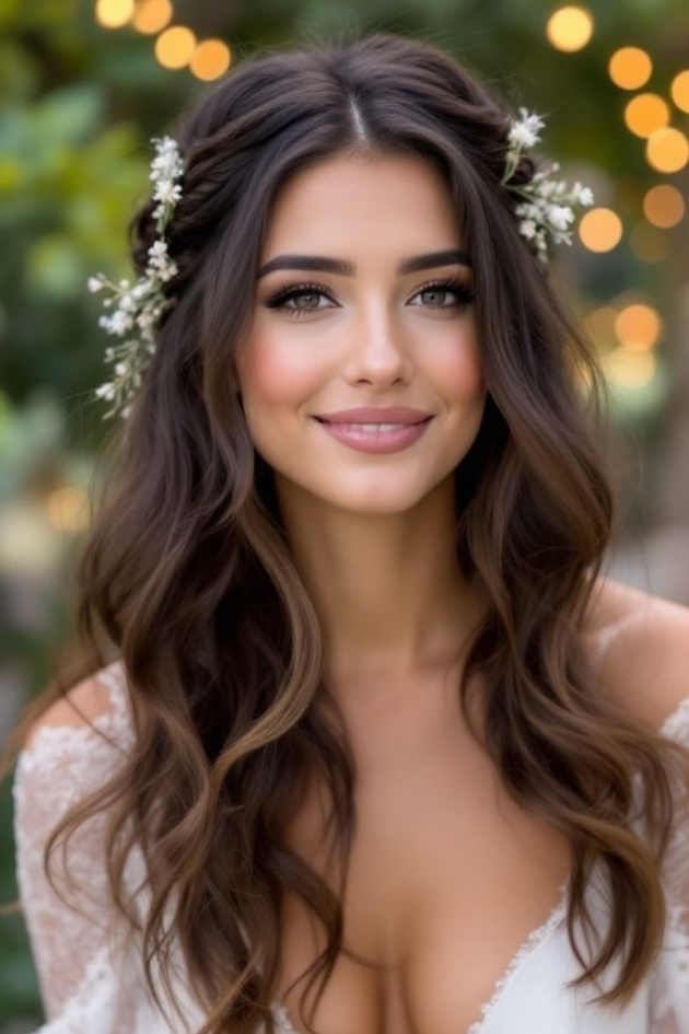 Create a natural wedding look by styling your hair into soft loose waves with a middle part. Add delicate floral accents on both sides for a romantic boho-inspired bridal hairstyle.