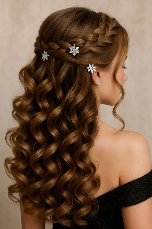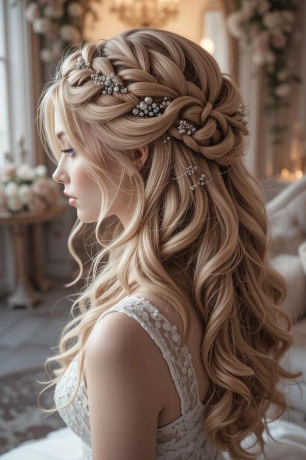This romantic hairstyle pairs soft crown braids with long, defined cascading waves for a graceful bridal or party look. Sparkling crystal pins add a delicate touch, making it perfect for weddings, receptions, and elegant evening events.