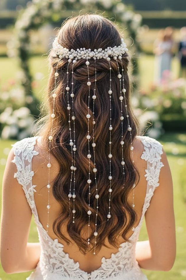 Create a graceful wedding look by styling your hair into soft half-up waves. Add a pearl drape headpiece with cascading strands to give your bridal hairstyle a luxurious, romantic finish perfect for outdoor ceremonies.