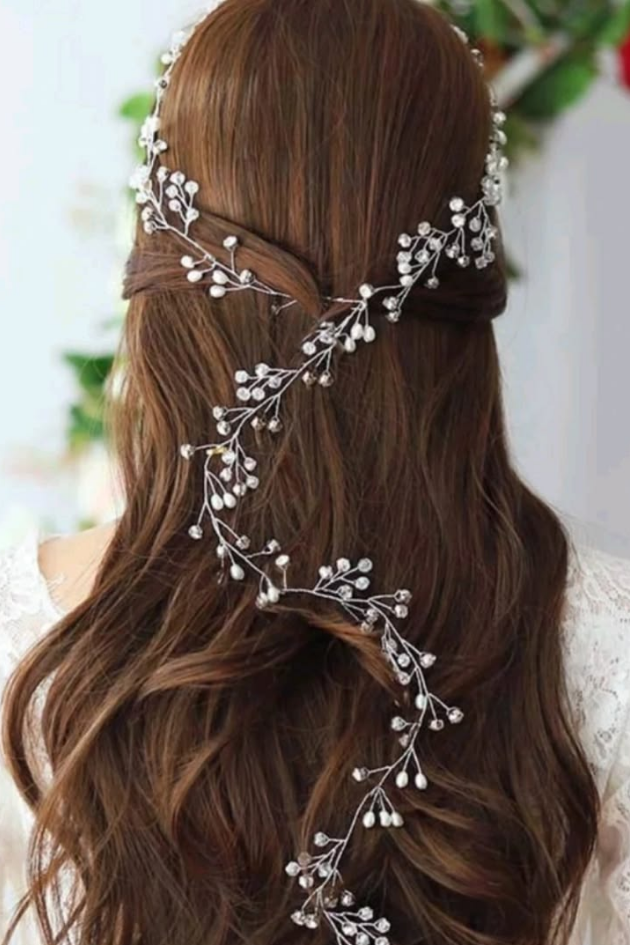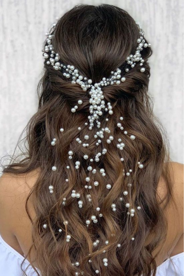 Create an elegant wedding look by styling your hair into soft half-up waves. Add cascading pearl pins and a statement pearl clip to give your bridal hairstyle a graceful, sparkling finish.