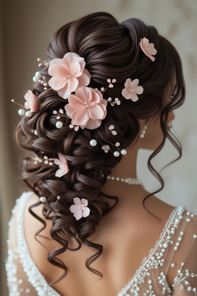 Style your wedding hair in a soft textured updo with cascading curls and delicate face-framing strands. Finish it with blush floral clips and pearl accents for an elegant bridal hairstyle that feels dreamy, feminine, and timeless.