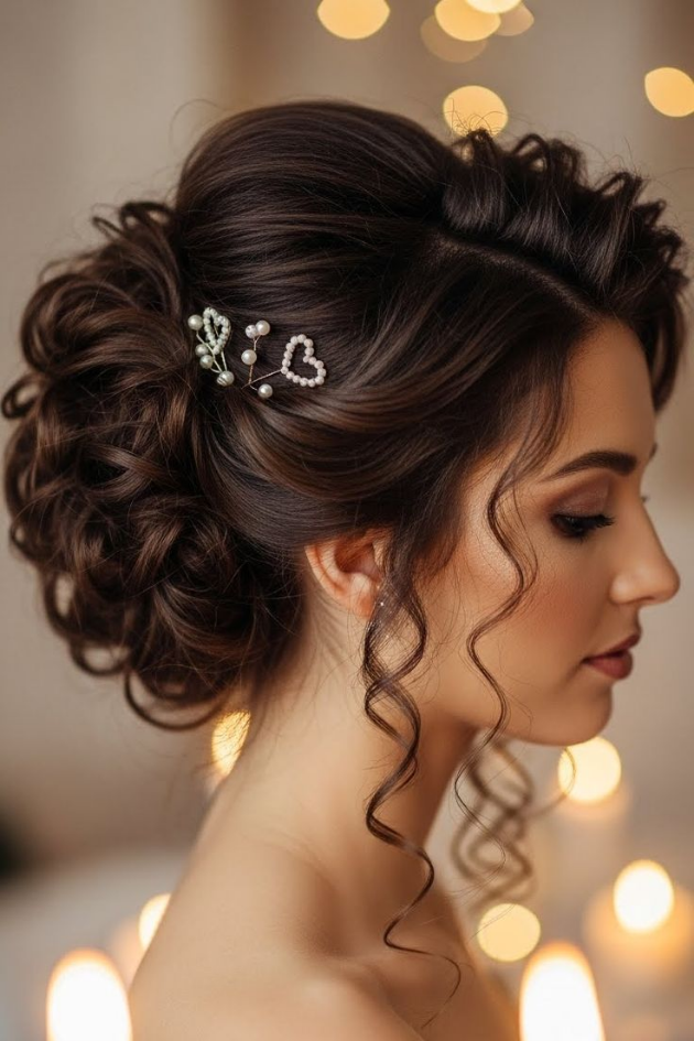Create a timeless bridal look with this voluminous low bun featuring soft curls and delicate face-framing tendrils. The pearl heart hair pins add a romantic, graceful touch, making it perfect for weddings, receptions, or engagement looks.