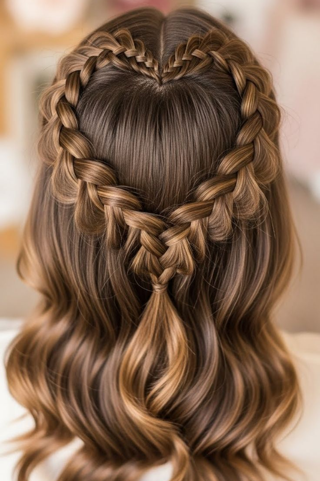 This charming hairstyle features a beautifully woven heart-shaped braid that flows into soft half-up waves. Perfect for weddings, date nights, bridesmaids, or romantic occasions, it blends playful elegance with a sweet and stylish finish.