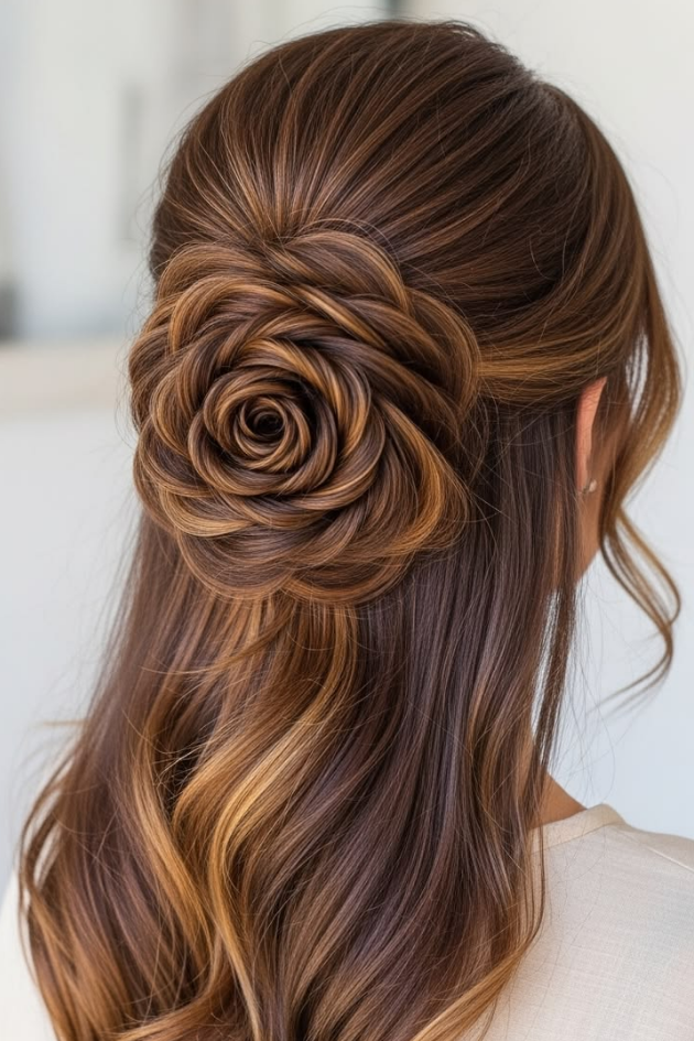 A stunning half-up hairstyle featuring a beautifully crafted rose-shaped bun and soft flowing waves. Perfect for weddings, bridesmaids, parties, or elegant occasions, this look adds a romantic floral touch with timeless sophistication and charm.