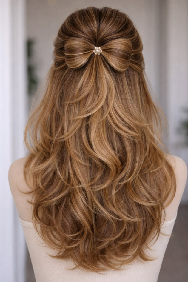This elegant half-up hairstyle features a beautifully styled hair bow at the crown with soft cascading waves. Perfect for weddings, parties, bridesmaids, or special occasions, it adds a feminine, polished, and effortlessly charming touch.