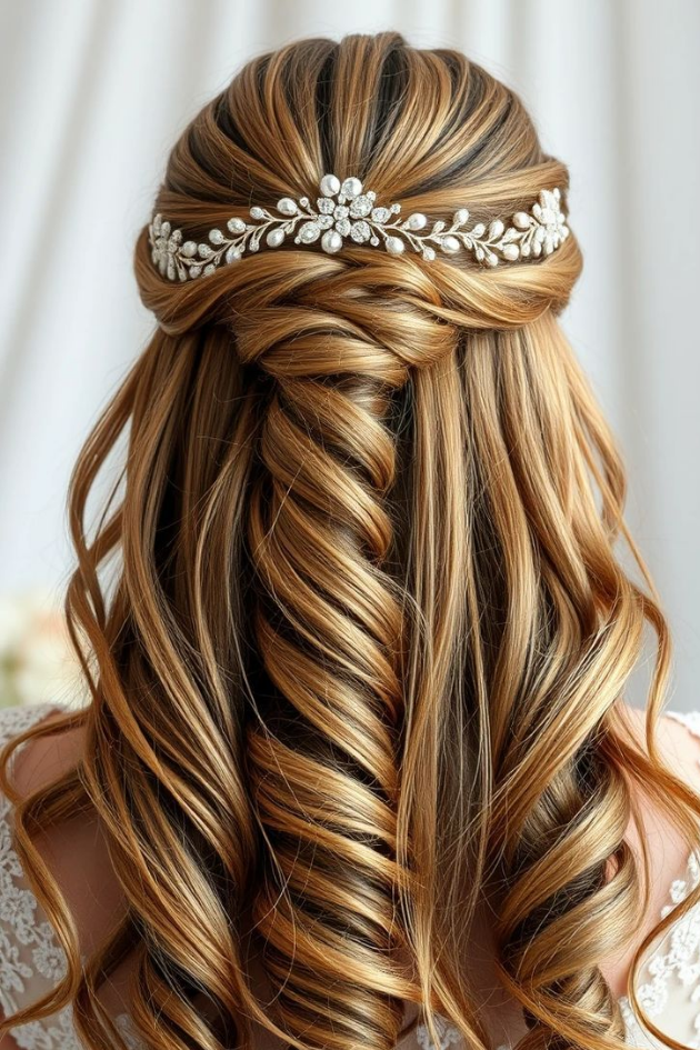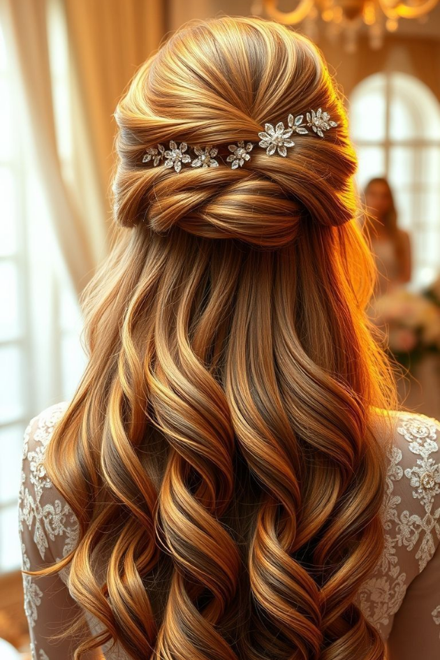Create a timeless wedding look by styling your hair into soft cascading waves with twisted half-up sections. Add crystal pins along the twists to give your bridal hairstyle a graceful, luxurious finish.
