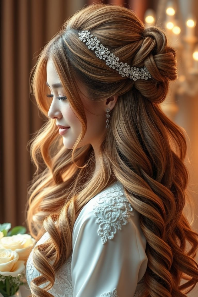 This graceful bridal hairstyle features a sleek twisted half-up design with flowing glam curls and a sparkling crystal headband. Perfect for weddings, receptions, or engagement looks, it creates an elegant, princess-inspired finish with timeless charm.