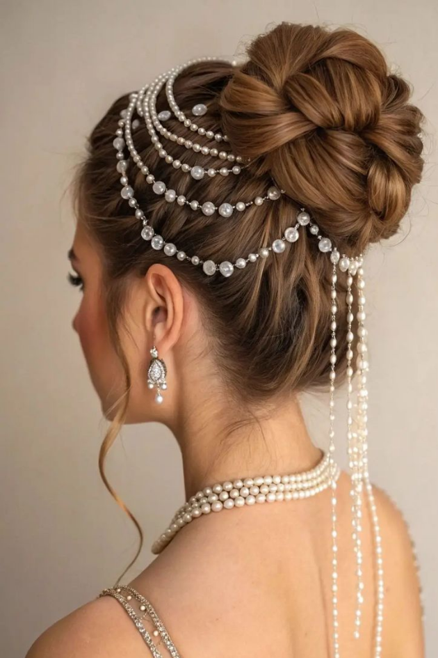 An elegant high bridal bun adorned with cascading pearl strands that drape gracefully across the hair and down the back. This luxurious hairstyle adds a royal, glamorous touch, making it perfect for weddings, receptions, and special bridal occasions.