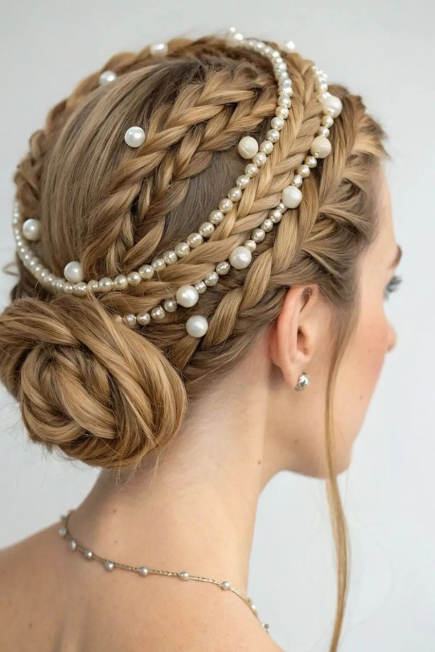 This sophisticated bridal hairstyle combines intricate crown braids with a low twisted bun, beautifully accented by cascading pearl strands. A perfect choice for weddings, receptions, or formal events, it offers a regal, elegant, and timeless bridal look.