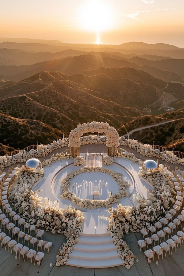 Host your wedding at this breathtaking mountaintop venue, surrounded by expansive views and luxurious floral arrangements. This perfect setup provides an unforgettable, elegant atmosphere for a romantic and picturesque ceremony with panoramic beauty.