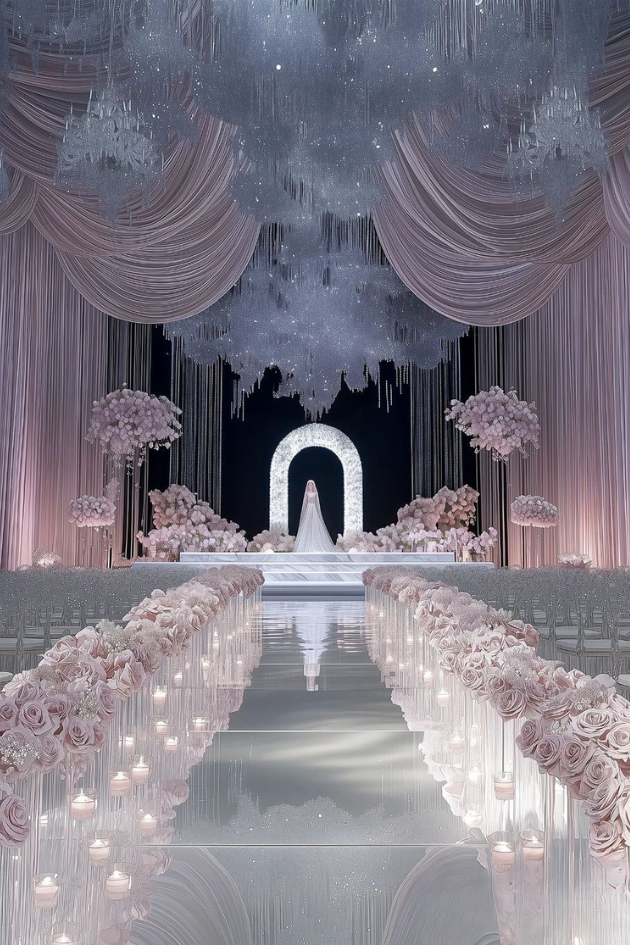 Elevate your wedding with this glamorous, sparkling wedding venue. A dazzling aisle adorned with roses and soft candles leads you to the grand stage, while the sparkling drapes and chandeliers create a magical atmosphere.