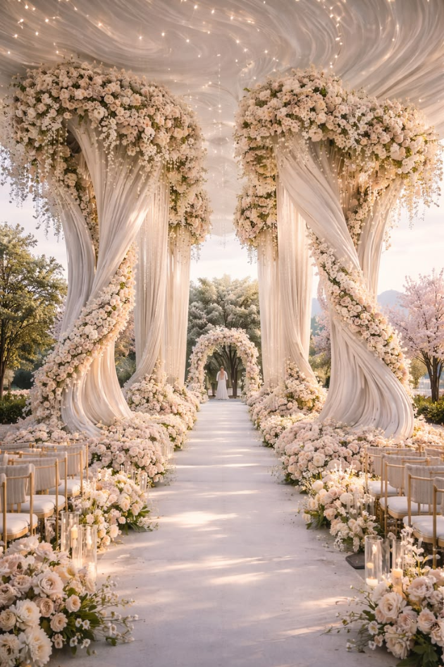 Create an enchanting atmosphere for your wedding with floral archways and delicate white drapery. Softly lit and adorned with beautiful blooms, this setup adds a magical touch to your ceremony, leading to your fairytale moment.