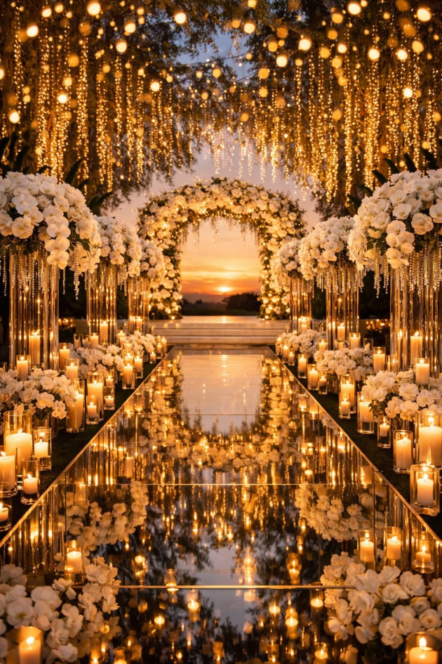 Create a magical and luxurious wedding ambiance with golden lights and romantic candle arrangements. The pathway, illuminated with candles and stunning floral arches, reflects the love and beauty of your unforgettable day.