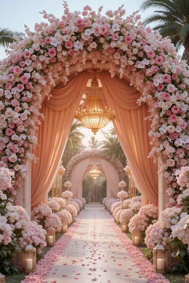 Transform your wedding aisle into a breathtaking spectacle with soft pink roses, chandeliers, and lanterns. The rose petal-lined path creates a romantic and enchanting atmosphere, leading you to your happily ever after.