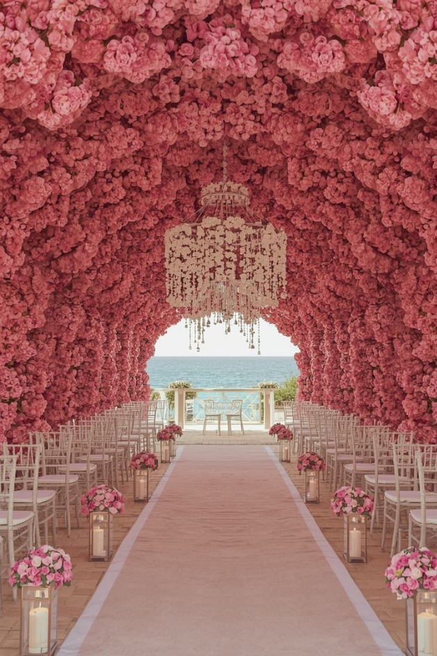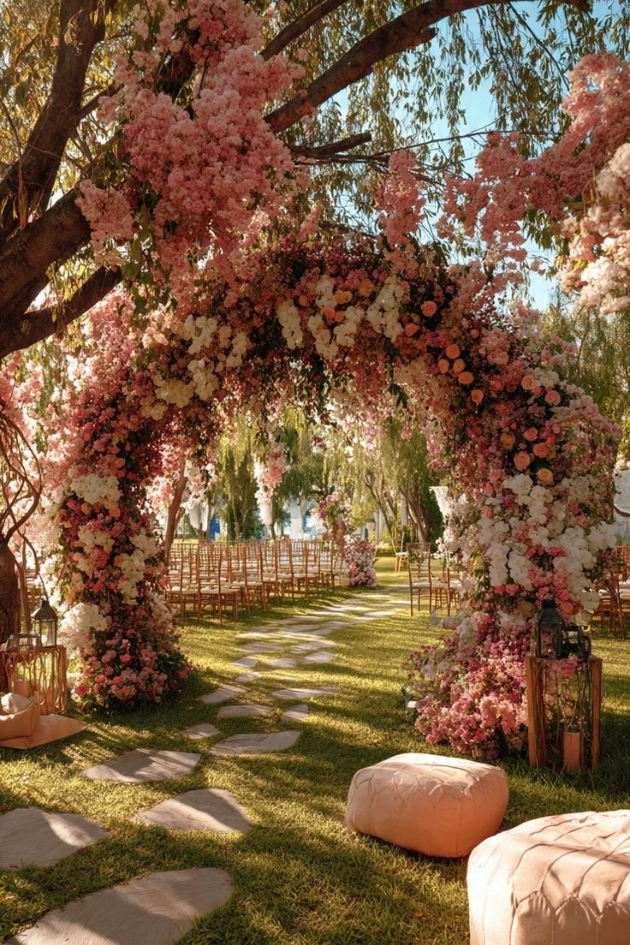 Walk under a canopy of pink and white blooms towards your dream ceremony. Surrounded by nature’s beauty, this floral-filled pathway creates a magical and romantic atmosphere for your special day.
