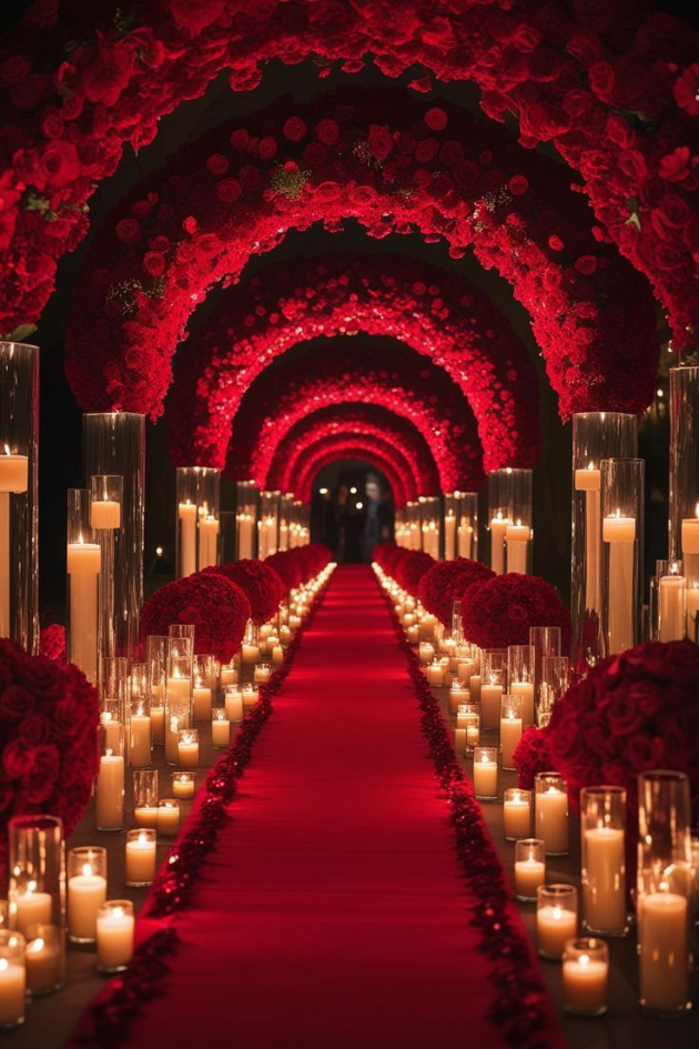 For a romantic and dramatic wedding, create a captivating red floral aisle with towering roses and glowing candles. This bold design will guide you to your vows in style, perfect for a passionate celebration.