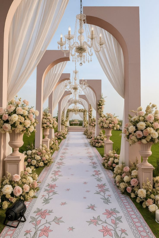 Transform your wedding aisle with soft pastel flowers, elegant chandeliers, and a beautifully designed floral carpet. This setup brings a serene and romantic atmosphere, perfect for a fairytale-like wedding walk down the aisle.