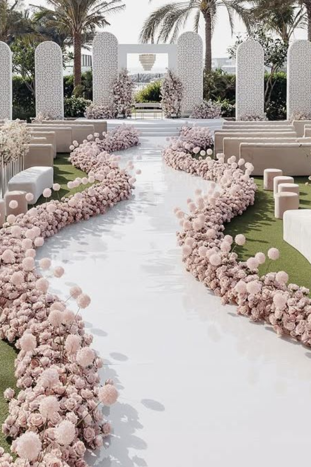 Create a dreamy wedding walk with a flowing floral path adorned with delicate pink flowers. This modern setup, complemented by sleek seating and arches, offers an elegant and serene atmosphere for your special day.