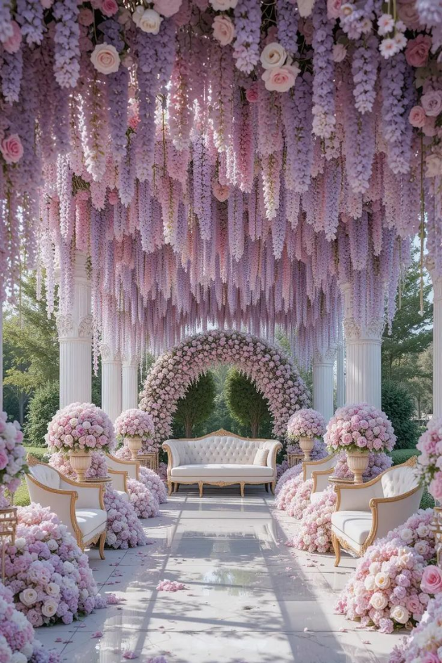 Embrace a fairytale ambiance with a lavender and pink floral arch, draped in cascading flowers. Create a romantic setting with elegant seating and lush floral arrangements that will enchant your guests and add sophistication.