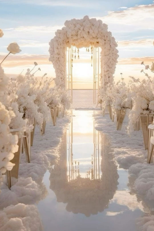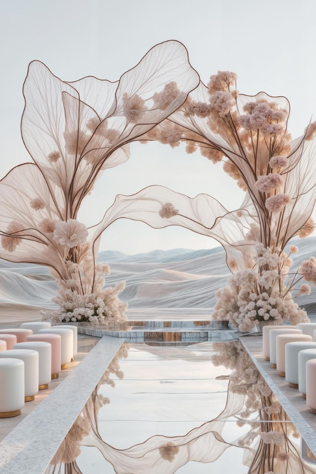 Step into a surreal landscape where flowing, delicate floral arches blend seamlessly with the tranquil beauty of a mirrored aisle. This ethereal design, set against the soft horizon, creates a wedding ceremony like no other.
