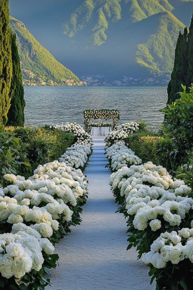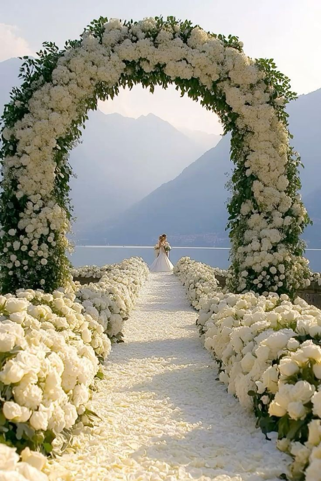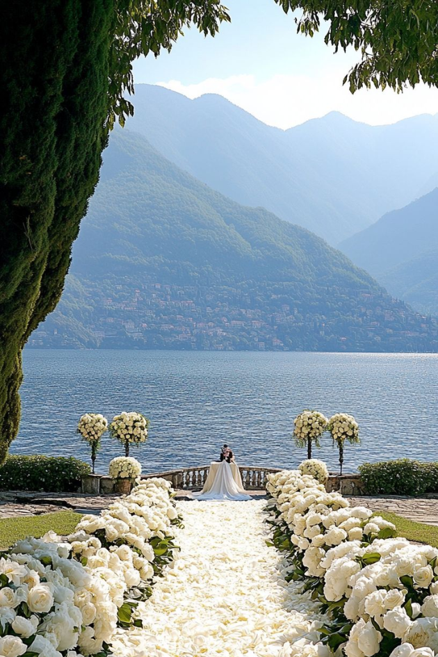 Walk down a breathtaking aisle of white rose petals, framed by floral arrangements and the stunning backdrop of a serene lake and mountains. This peaceful, romantic setting creates an unforgettable moment for your wedding day.